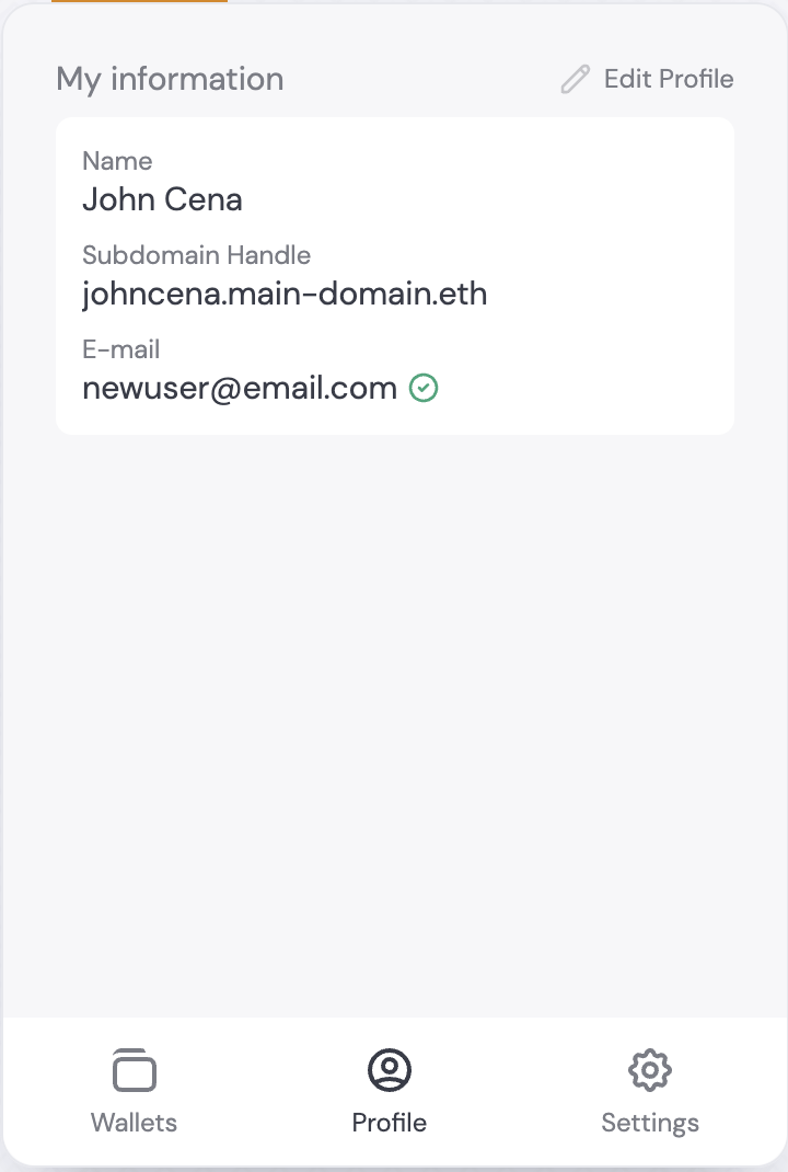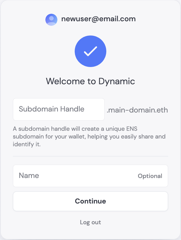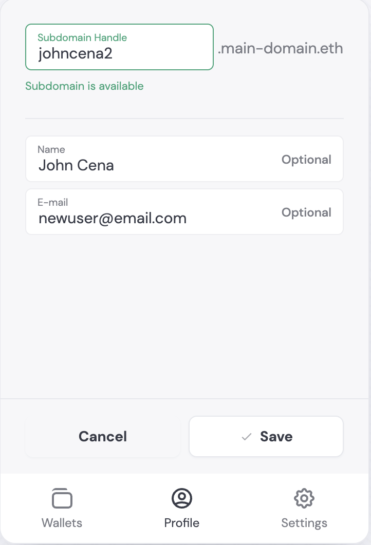 Global Identity allows your users to select personal subdomains for their wallets, tied to one main domain name. These subdomains function as unique identifiers associated with that user’s wallet address. A user’s subdomain will look like this:custom-subdomain.main-domain.eth