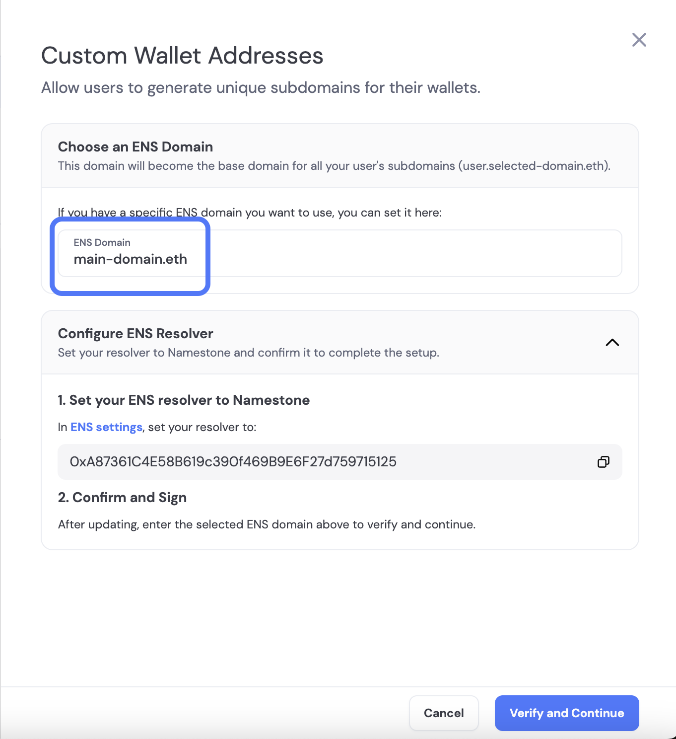 - Click “Verify and Continue” and sign the message from Namestone to verify your domain. Make sure that your primary wallet (in the top right corner of the dashboard) is the wallet associated with your domain.