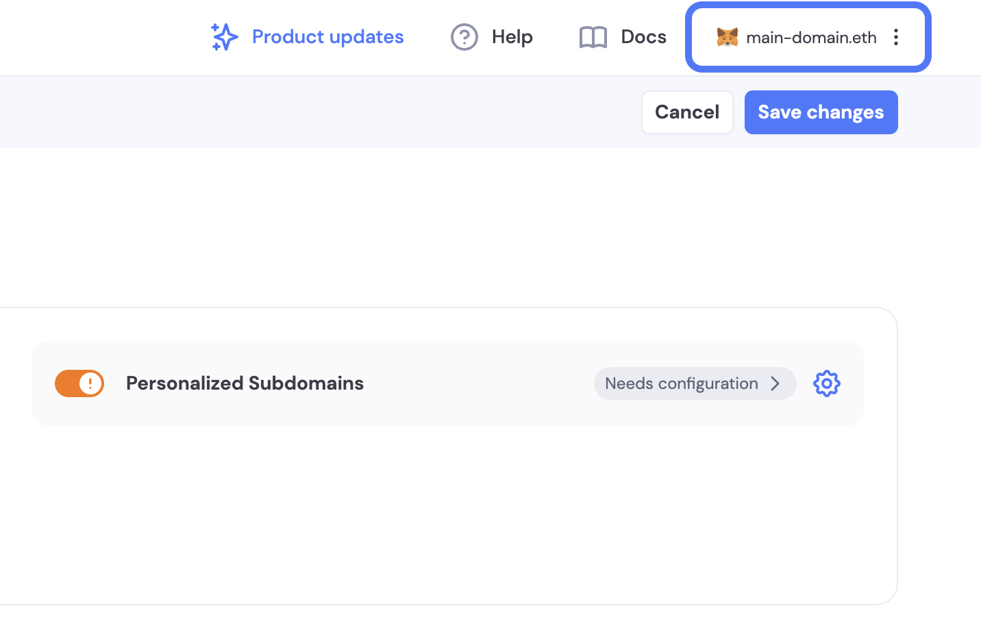 The require subdomains toggle will ask your users to choose a subdomain when they sign up or register with a new wallet.